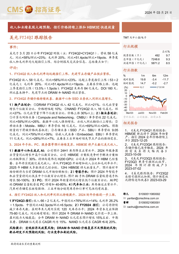 【海通证券】【20240321】电子行业美光FY24Q2跟踪报告:收入和业绩表现大超预期,指引价格持续上涨和HBM3E快速放量-10页