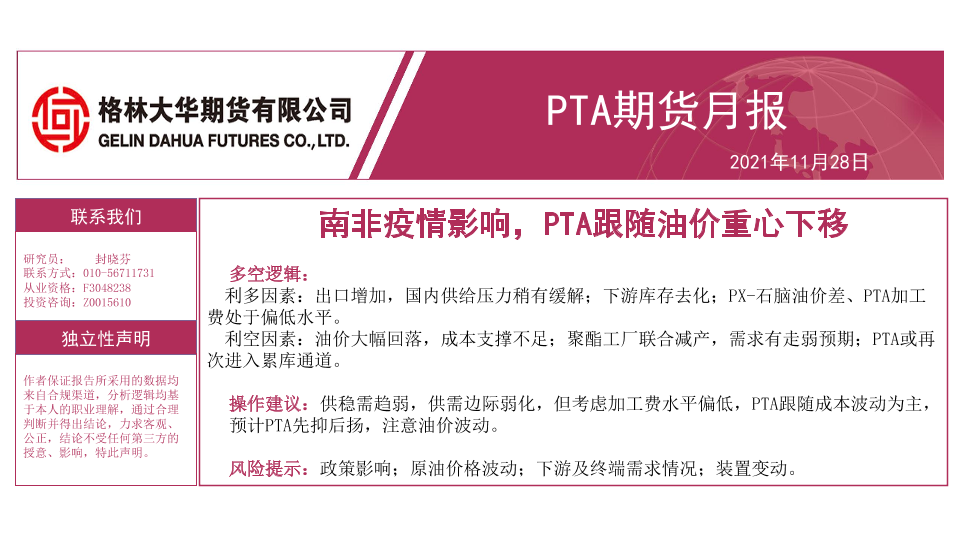 【格林大华期货】【20211128】PTA期货月报:南非疫情影响,PTA跟随油价重心下移-19页
