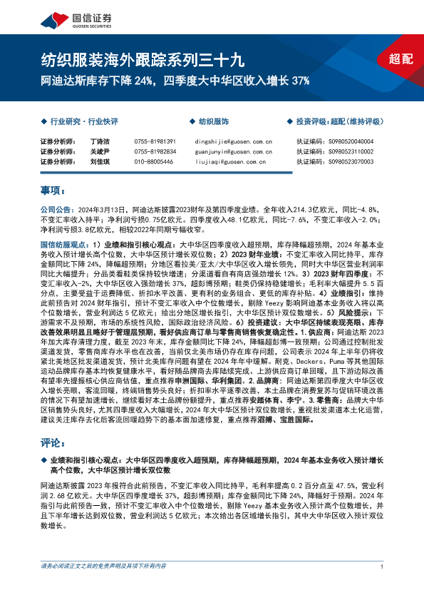 【国信证券】【20240315】纺织服装海外跟踪系列三十九:阿迪达斯库存下降24%,四季度大中华区收入增长37%-10页