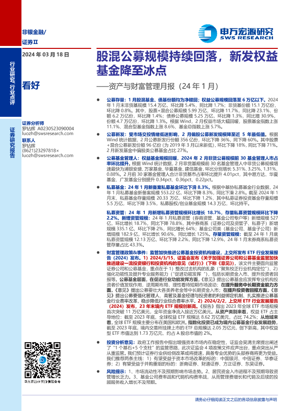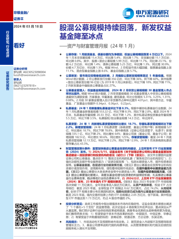 【申万宏源】【20240318】证券行业资产与财富管理月报(24年1月):股混公募规模持续回落,新发权益基金降至冰点-18页
