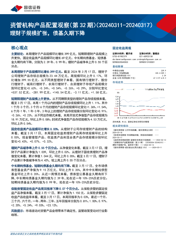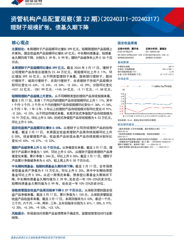 【国信证券】【20240320】资管机构产品配置观察(第32期):理财子规模扩张,债基久期下降-16页