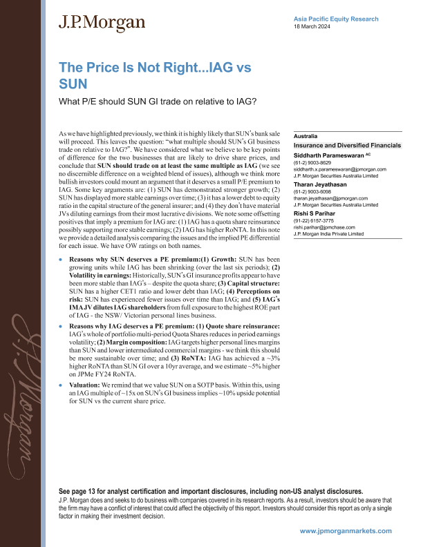 【J.P. Morgan】【20240318】The Price Is Not Right...IAG vs SUN What PE should SUN GI trade on relative to IAG?-18页