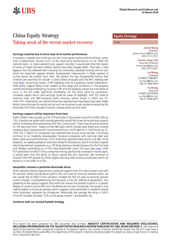 【UBS Securities Asia Limited】【20240312】China Equity Strategy - Taking stock of the recent market recovery-11页