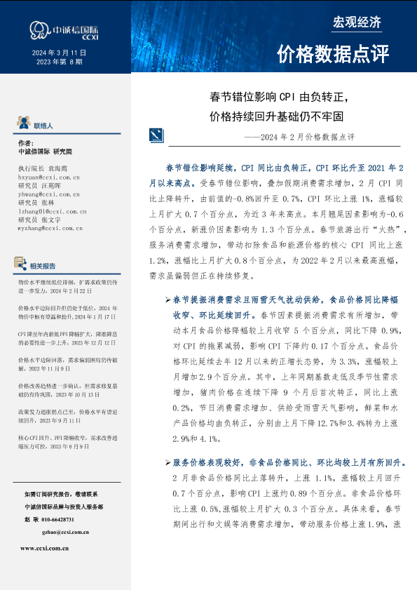 【中诚信国际】【20240222】春节错位影响CPI由负转正,价格持续回升基础仍不牢固-6页