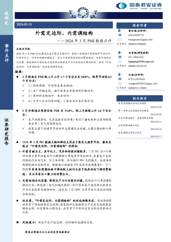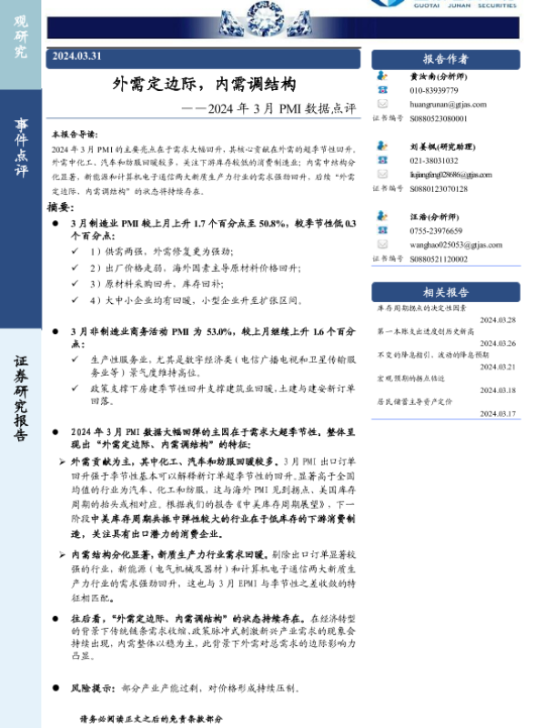 【国泰君安证券】【20240331】2024年3月PMI数据点评:外需定边际,内需调结构-11页