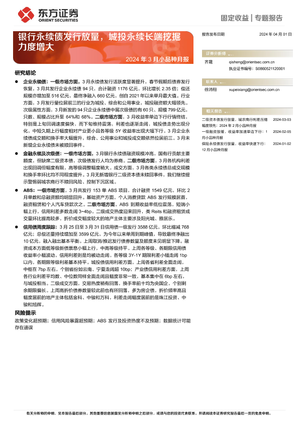 【东方证券】【20240401】2024年3月小品种月报:银行永续债发行放量,城投永续长端挖掘力度增大-23页