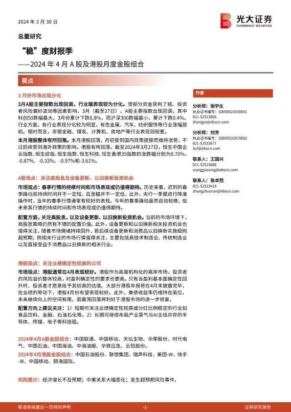 【光大证券】【20240330】2024年4月A股及港股月度金股组合:“稳”度财报季-23页
