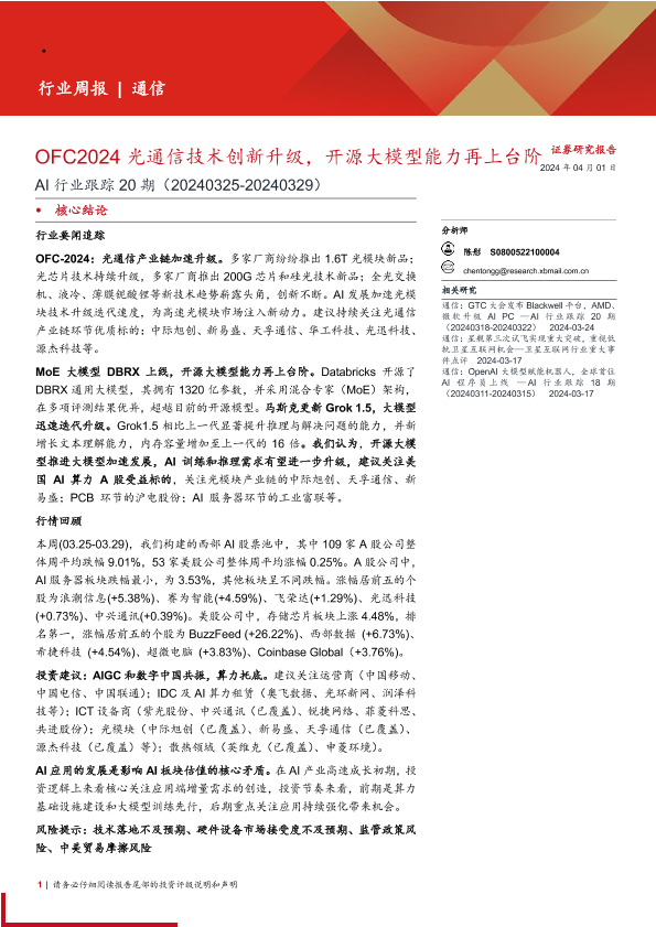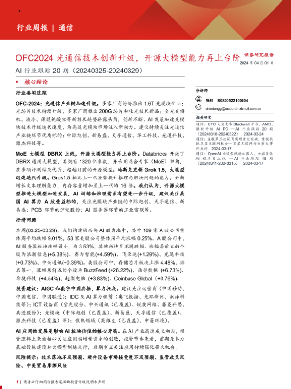 【西部证券】【20240401】AI行业跟踪20期:OFC2024光通信技术创新升级,开源大模型能力再上台阶-12页