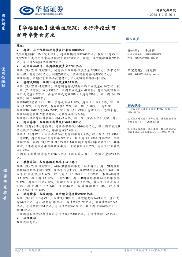 【华福证券】【20240330】流动性跟踪:央行净投放呵护跨季资金需求-13页