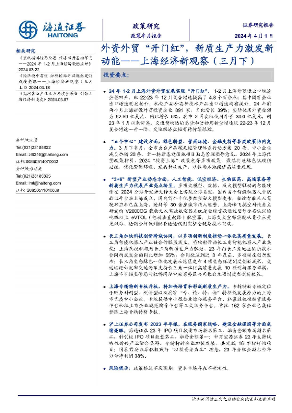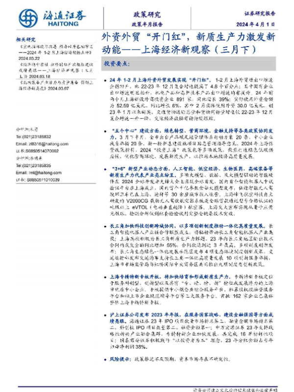【海通证券】【20240401】上海经济新观察(三月下):外资外贸开门红,新质生产力激发新动能-18页