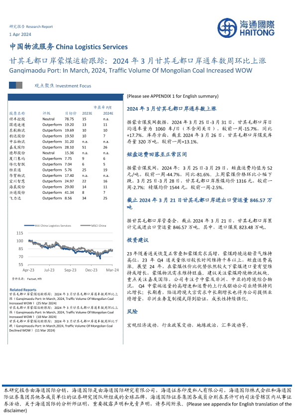 【海通国际】【20240325】中国物流服务行业:甘其毛都口岸蒙煤运输跟踪,2024年3月甘其毛都口岸通车数周环比上涨-10页