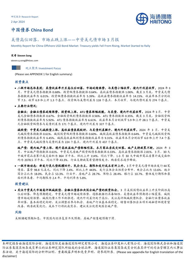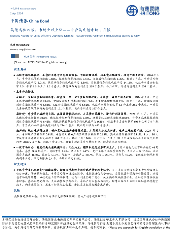 【海通国际】【20240402】美债高位回落,市场止跌上涨——中资美元债市场3月报-20页
