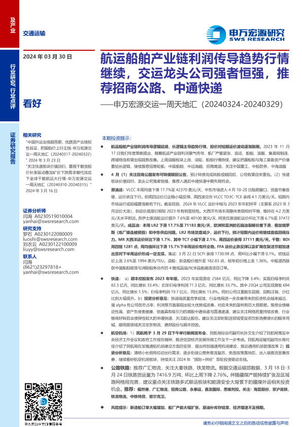 【申万宏源】【20240330】交运行业一周天地汇:航运船舶产业链利润传导趋势行情继续,交运龙头公司强者恒强,推荐招商公路、中通快递-18页