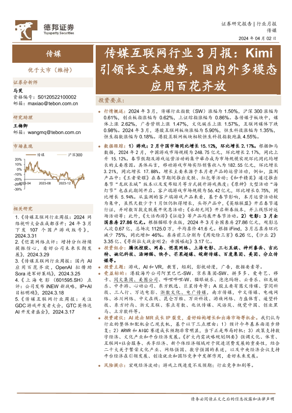【德邦证券】【20240402】传媒互联网行业3月报:Kimi引领长文本趋势,国内外多模态应用百花齐放-13页