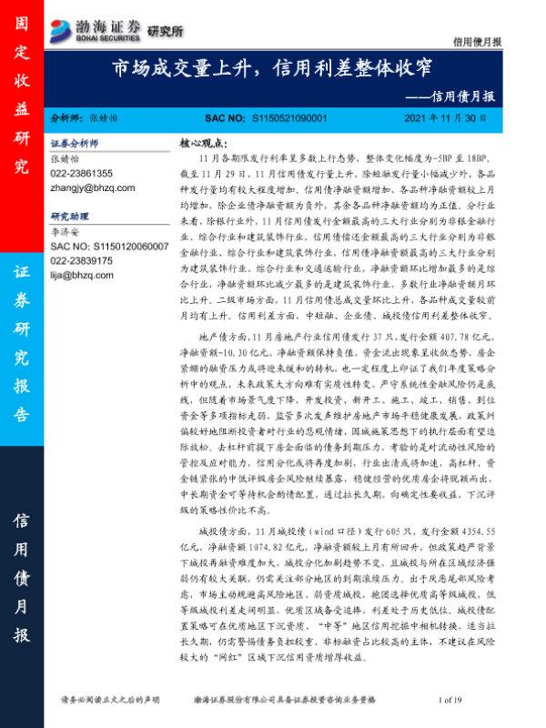 【渤海证券】【20211130】信用债月报:市场成交量上升,信用利差整体收窄-19页