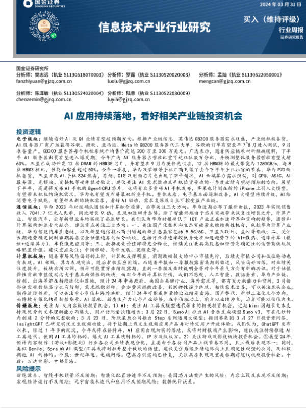 【国金证券】【20240331】信息技术产业行业研究:AI应用持续落地,看好相关产业链投资机会-18页