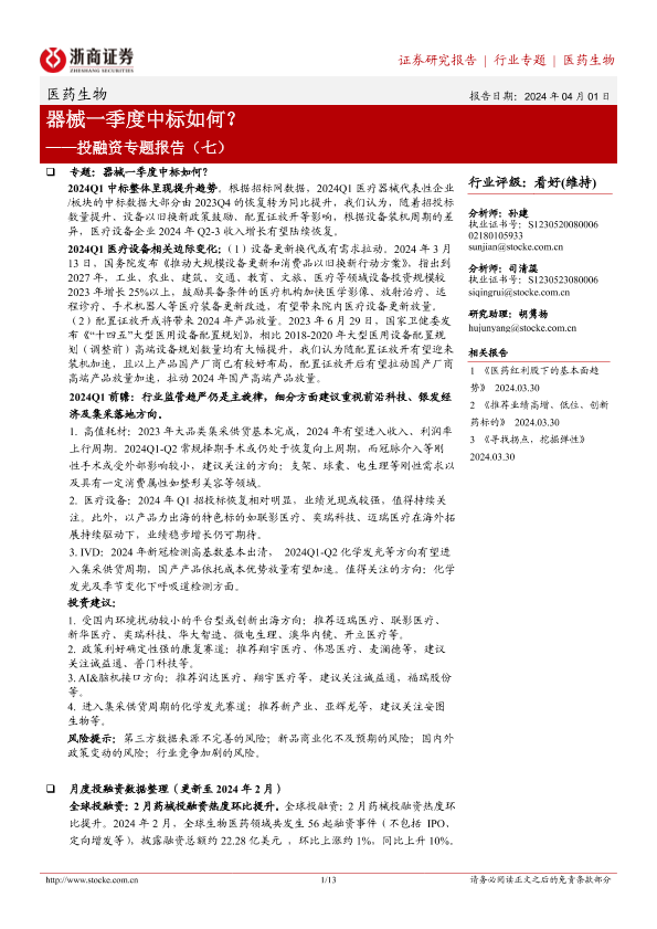 【浙商证券】【20240401】医药生物行业投融资专题报告(七):器械一季度中标如何?-13页