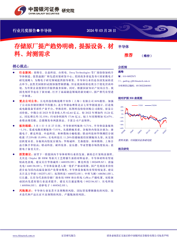 【银河证券】【20240328】半导体行业月度报告:存储原厂提产趋势明确,提振设备、材料、封测需求-10页