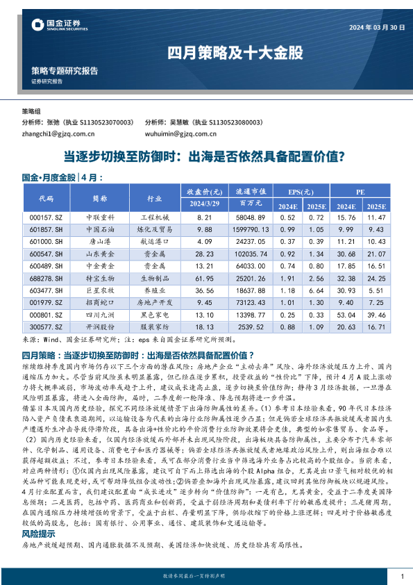 【国金证券】【20240330】四月策略及十大金股-当逐步切换至防御时:出海是否依然具备配置价值?-17页