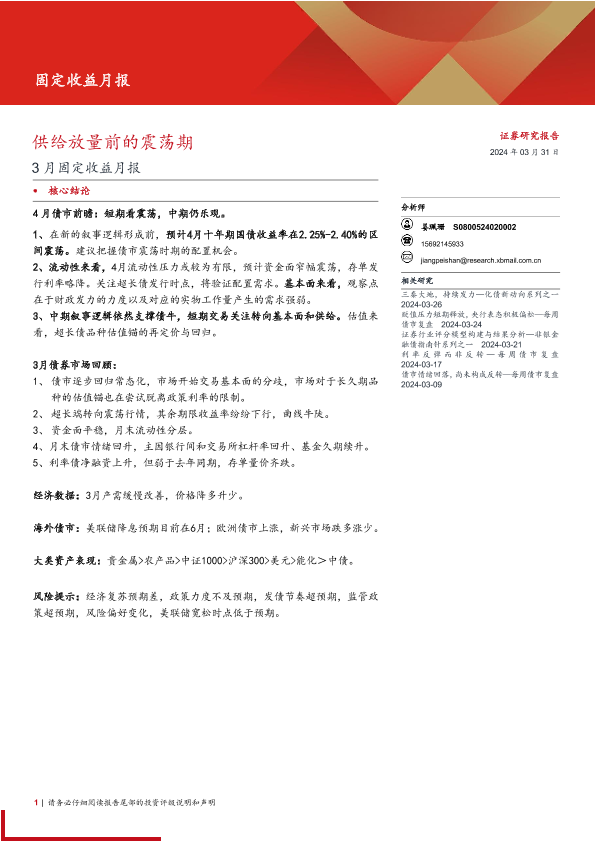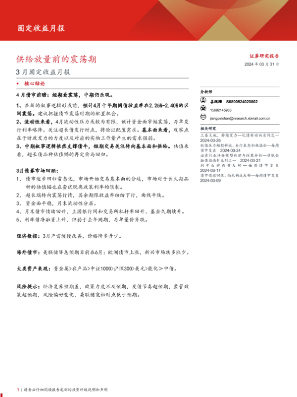 【西部证券】【20240331】固定收益月报:供给放量前的震荡期-22页
