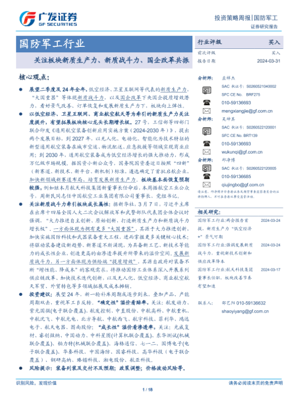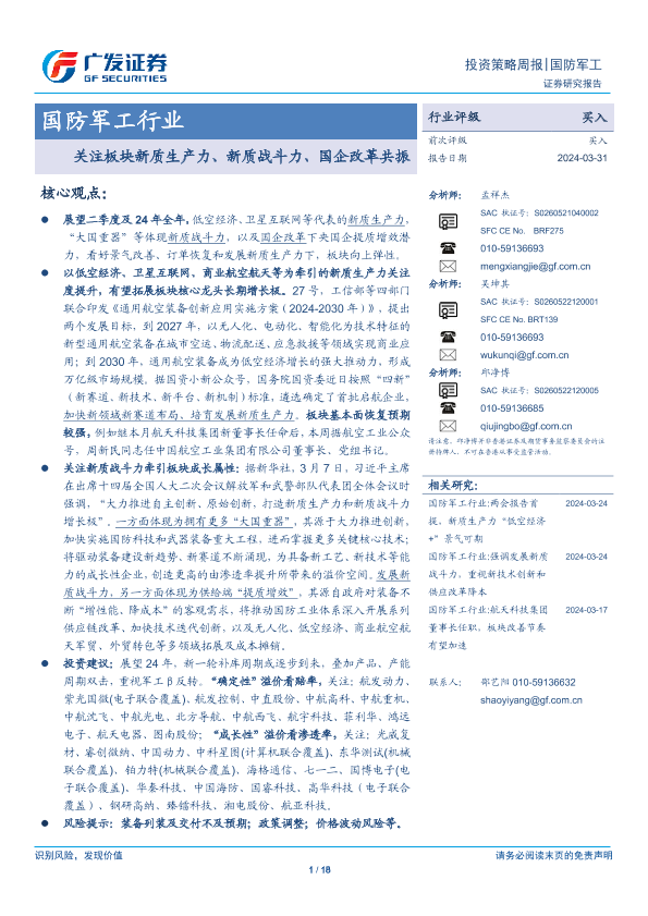 【广发证券】【20240331】国防军工行业:关注板块新质生产力、新质战斗力、国企改革共振-18页