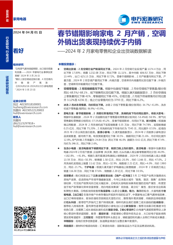 【申万宏源】【20240401】家用电器行业2024年2月家电零售和企业出货端数据解读:春节错期影响家电2月产销,空调外销出货表现持续优于内销-14页