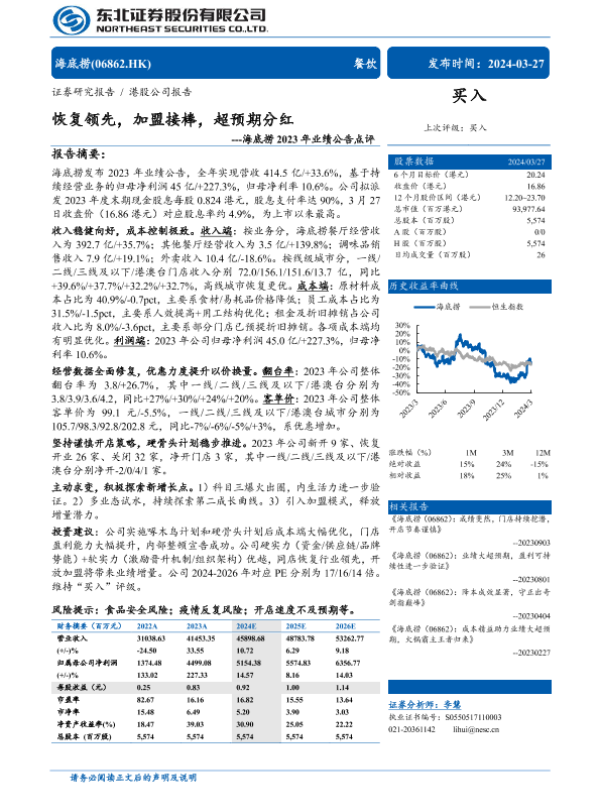 【东北证券】【20240327】海底捞(6862.HK)2023年业绩公告点评:恢复领先,加盟接棒,超预期分红-10页