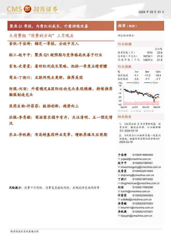 【海通证券】【20240331】消费品行业大消费组“消费的方向”三月观点:聚焦Q1季报,内需红利成长,外需持续改善-13页
