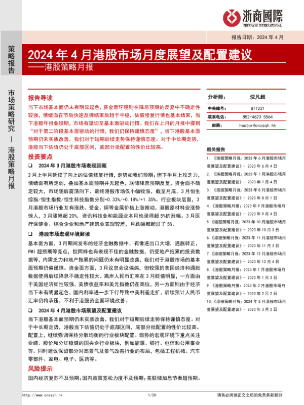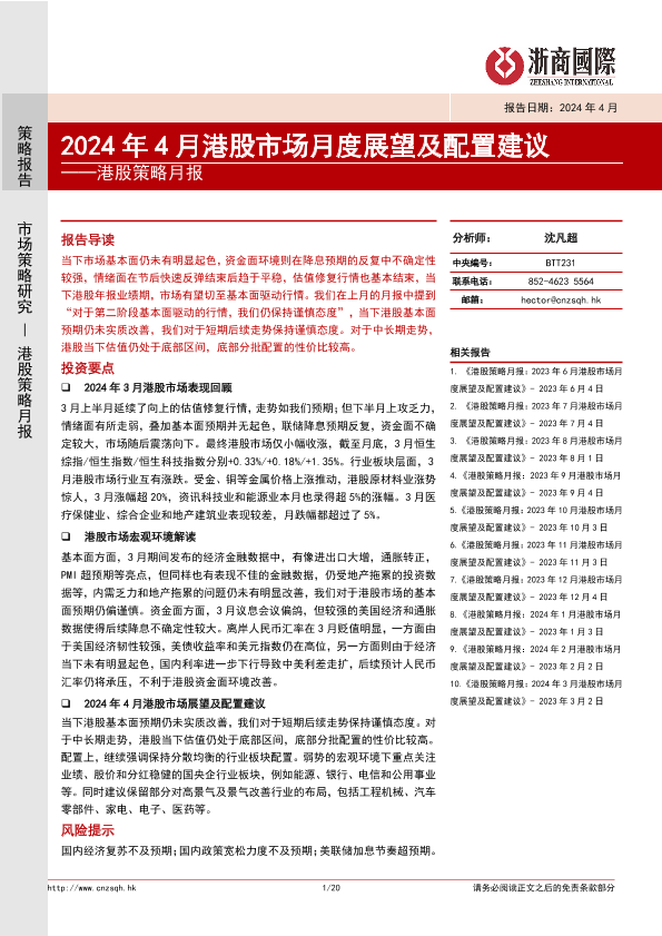 【浙商国际】【20240403】港股策略月报:2024年4月港股市场月度展望及配置建议-20页