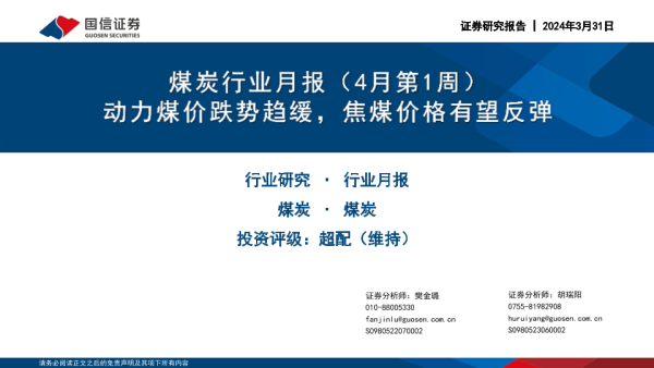 【国信证券】【20240331】煤炭行业月报(4月第1周):动力煤价跌势趋缓,焦煤价格有望反弹-37页