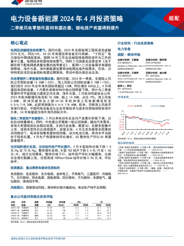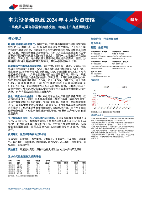 【国信证券】【20240403】电力设备新能源2024年4月投资策略:二季度风电零部件盈利有望改善,锂电排产有望得到提升-22页