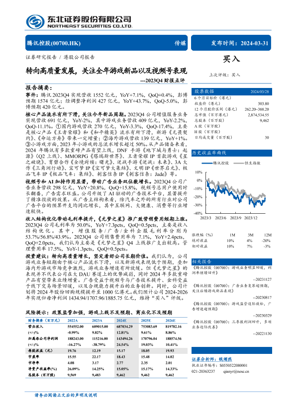 【东北证券】【20240331】腾讯控股(0700.HK)2023Q4点评:转向高质量发展,关注全年游戏新品以及视频号表现-12页