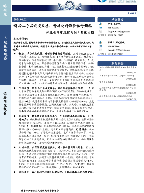【国泰君安证券】【20240402】行业景气度观察系列3月第4期:新房二手房成交改善,资源材料涨价信号频现-14页