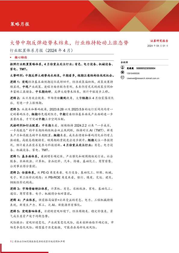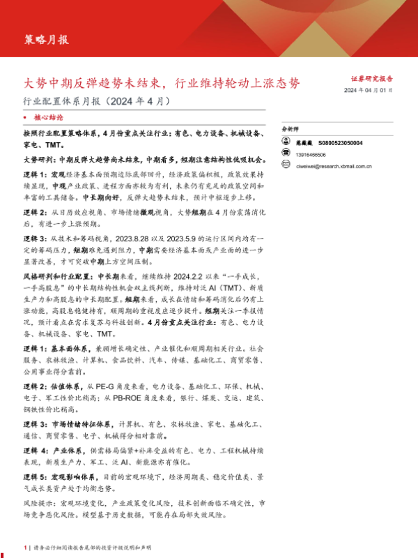 【西部证券】【20240401】行业配置体系月报(2024年4月) 大势中期反弹趋势未结束,行业维持轮动上涨态势-17页