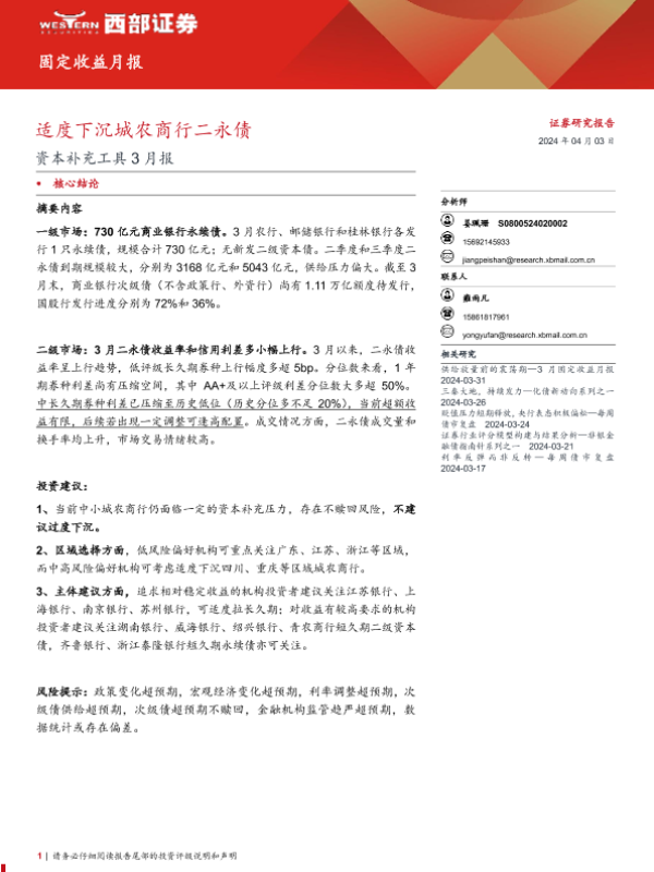 【西部证券】【20240403】资本补充工具3月报:适度下沉城农商行二永债-16页