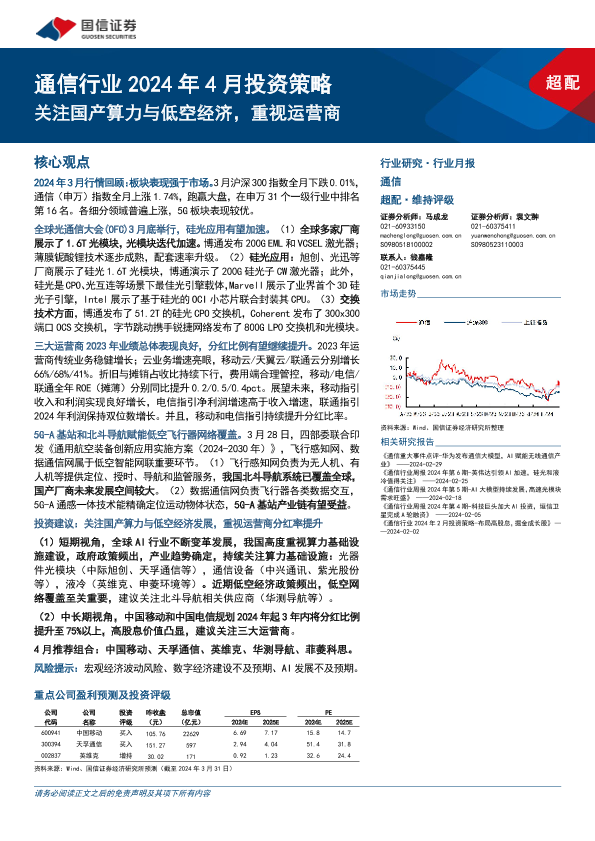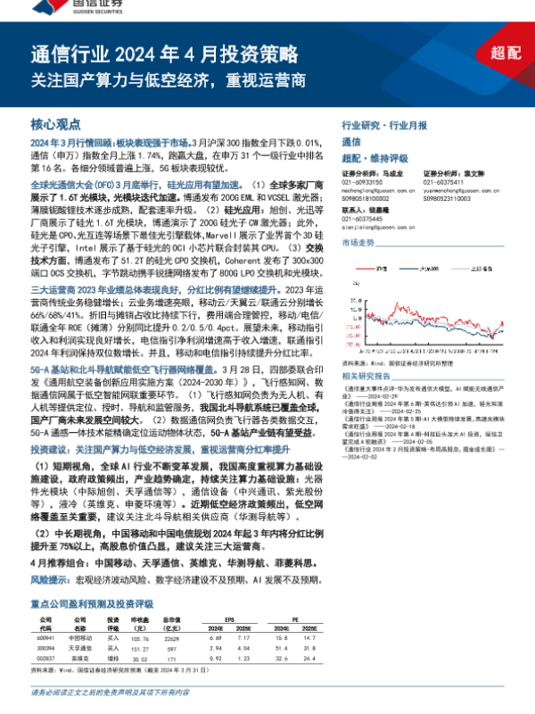 【国信证券】【20240401】通信行业2024年4月投资策略:关注国产算力与低空经济,重视运营商-32页