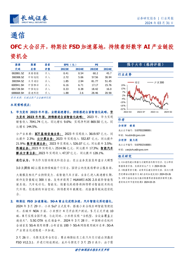 【长城证券】【20240331】通信行业报告:OFC大会召开,特斯拉FSD加速落地,持续看好数字AI产业链投资机会-21页