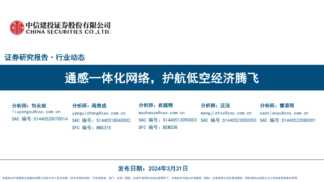【中信建投证券】【20240331】通信行业:通感一体化网络,护航低空经济腾飞-33页