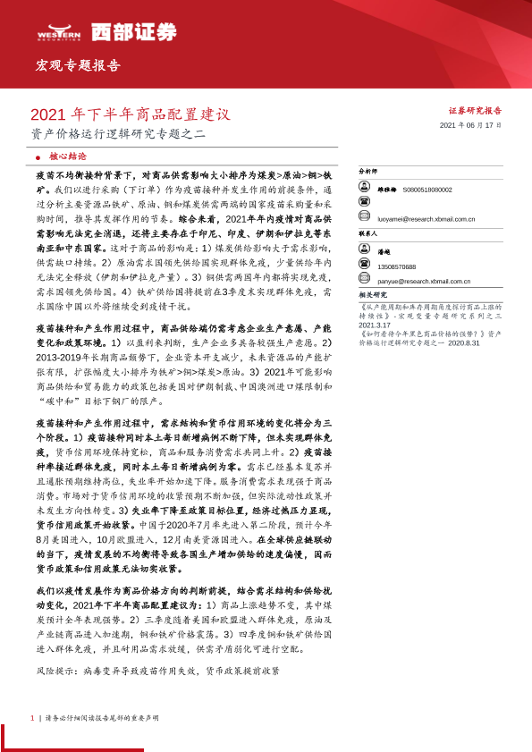 【西部证券】【20210617】资产价格运行逻辑研究专题之二:2021年下半年商品配置建议-21页