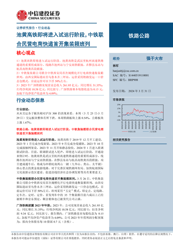【中信建投证券】【20240331】铁路公路行业动态:池黄高铁即将进入试运行阶段,中铁联合民营电商快递首开集装箱班列-17页