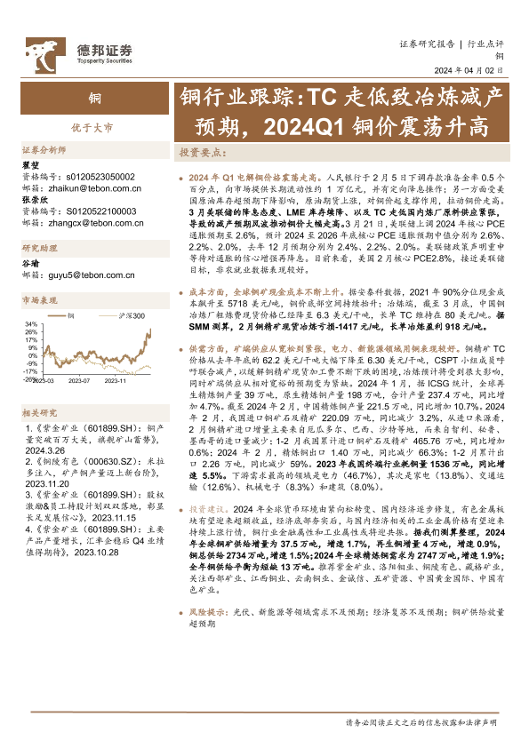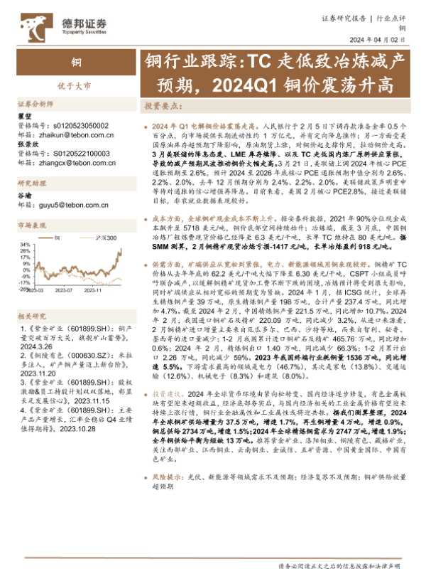 【德邦证券】【20240402】铜行业跟踪:TC走低致冶炼减产预期,2024Q1铜价震荡升高-12页