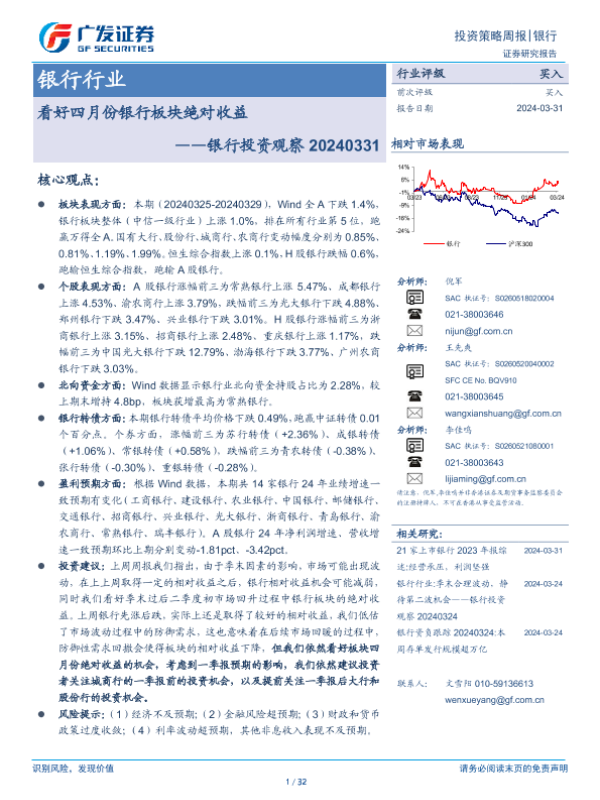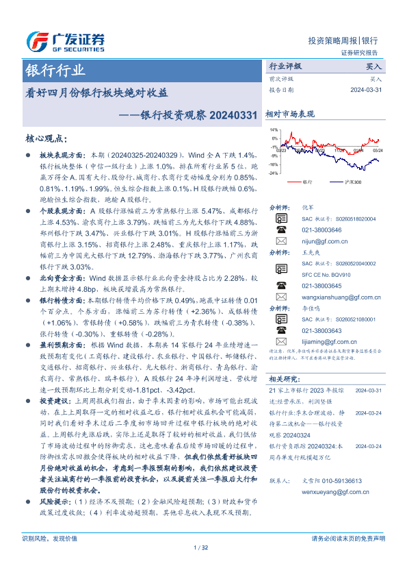 【广发证券】【20240331】银行行业银行投资观察:看好四月份银行板块绝对收益-30页