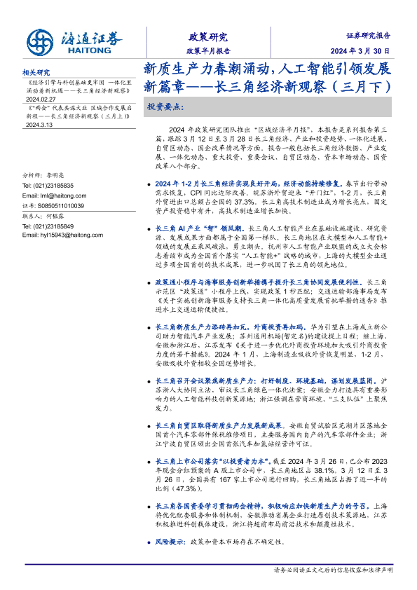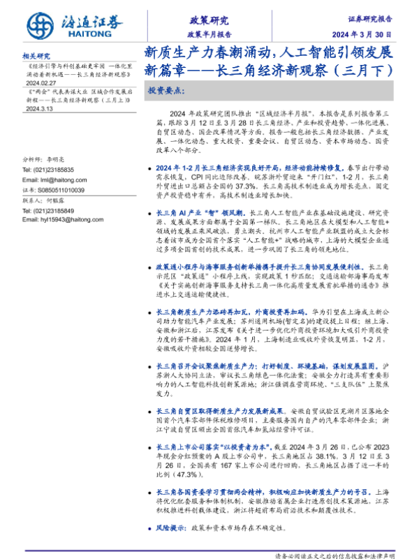 【海通证券】【20240330】长三角经济新观察(三月下):新质生产力春潮涌动,人工智能引领发展新篇章-15页