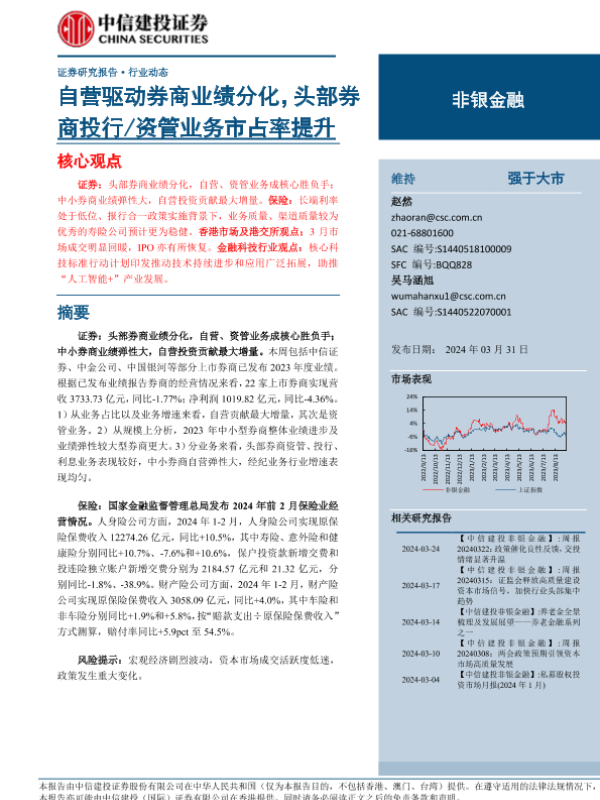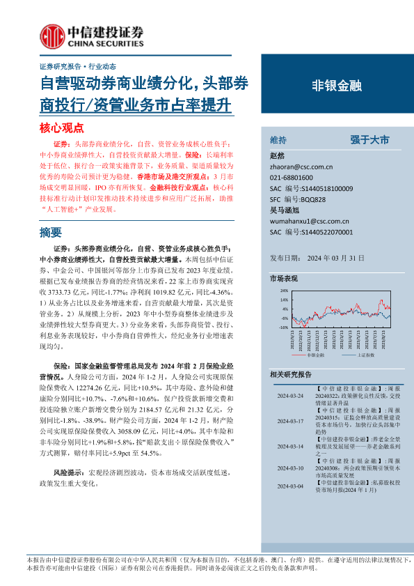 【中信建投证券】【20240331】非银金融行业动态:自营驱动券商业绩分化,头部券商投行/资管业务市占率提升-26页