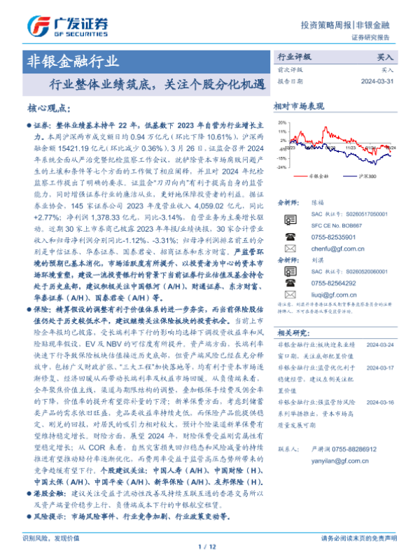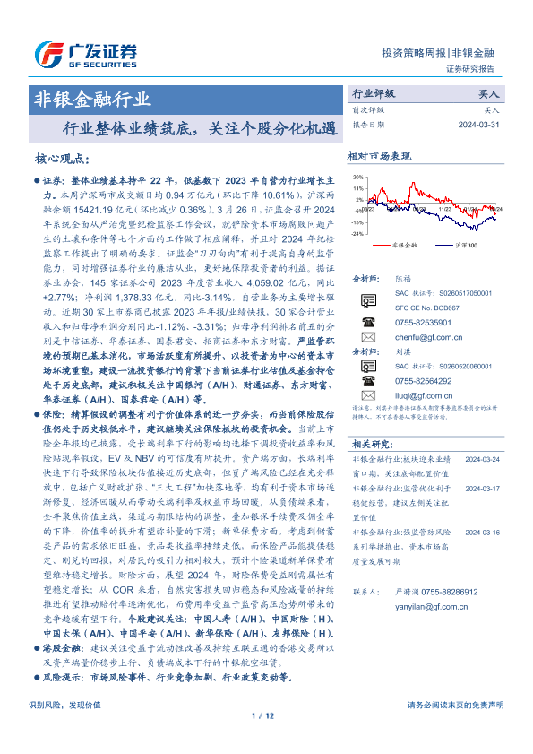 【广发证券】【20240331】非银金融行业:行业整体业绩筑底,关注个股分化机遇-12页