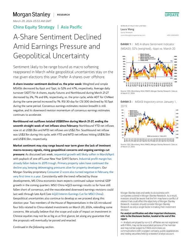 【Morgan Stanley】【20240327】Morgan Stanley-China Equity Strategy A-Share Sentiment Declined Amid Earnings Pressure and Geopolitical Uncertainty-11页