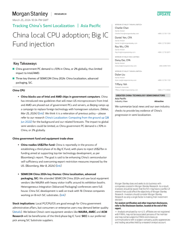 【Morgan Stanley】【20240325】Tracking China’s Semi Localization China local CPU adoption; Big IC Fund injection-16页
