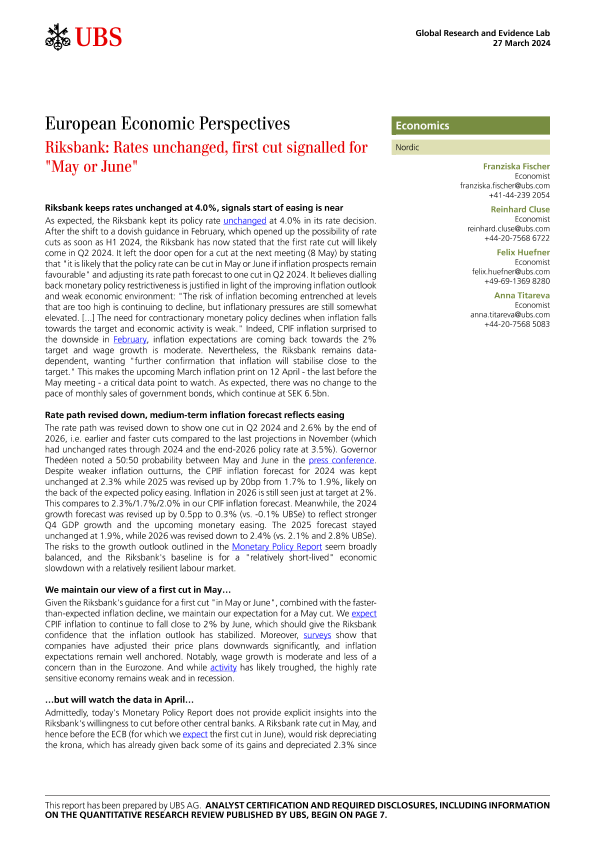 【UBS AG】【20240327】UBS Economics-European Economic Perspectives Riksbank Rates unchanged, first cut signalled for "May or June"-10页
