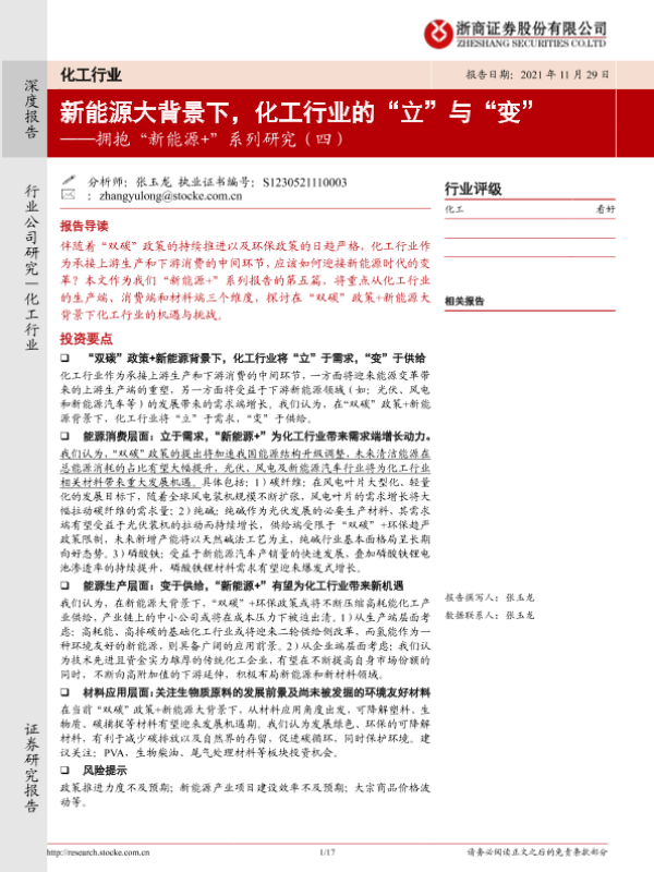 【浙商证券】【20211129】化工行业拥抱“新能源+”系列研究(四):新能源大背景下,化工行业的“立”与“变”-17页
