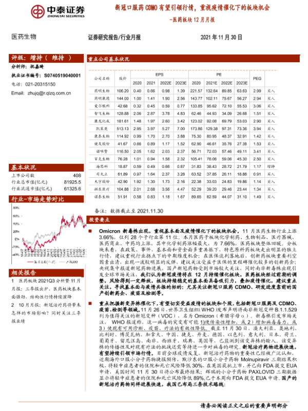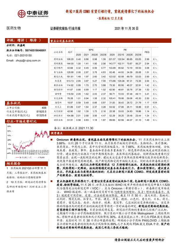【中泰证券】【20211130】医药生物行业医药板块12月月报:新冠口服药CDMO有望引领行情,重视疫情催化下的板块机会-19页